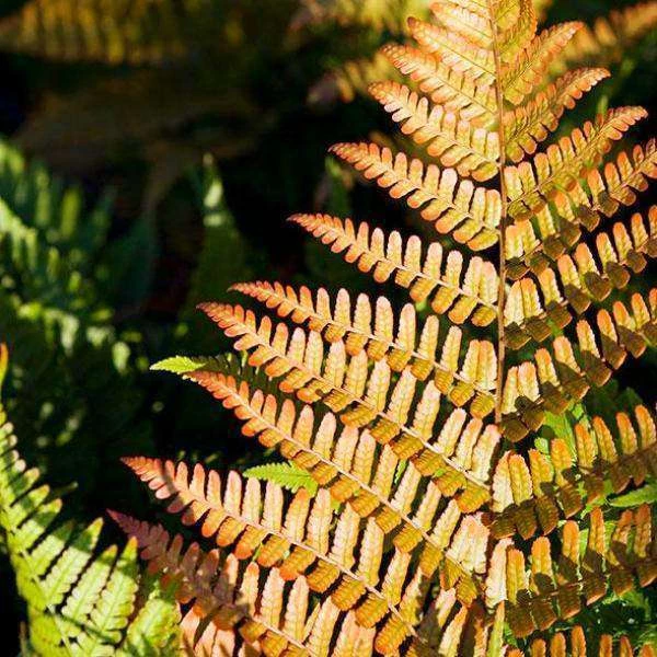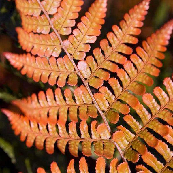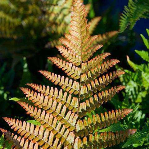 Dryopteris erythrosora. Showy bronze to orange-red new fronds distinguish this hardy evergreen fern. Refreshing accent for the shade garden. Interesting contrast with Hosta and other boldleaved perennials.