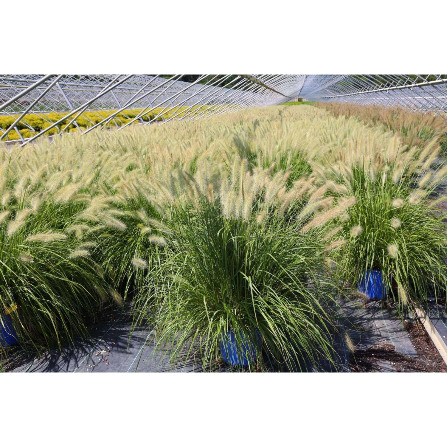This densely-tufted clumping grass has medium-green leaves that fade to yellow/beige in late fall. Showy silvery fox-tail blooms appear in a fountain-like spray in late summer. Easy to grow and requires little maintenance. Pennisetum alopecuroides.Â