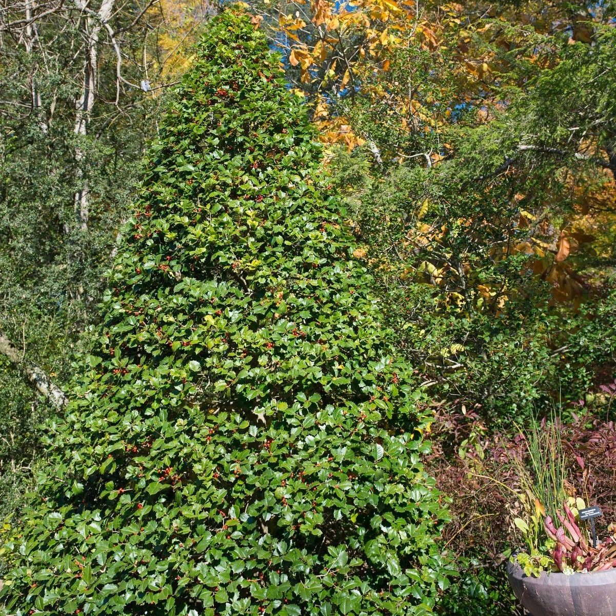 American Hollies are a popular evergreen tree. Normally pruned to be kept as small trees or shrubs. They will berry in fall through spring. Berries are bright red and are very popular to use in winter decoration. Dense foliage provides cover and nesting habitat for various birds. Ilex opaca