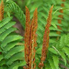The arching, finely-cut fronds are bright green, upright reproductive stems are a dark cinnamon color. Well suited for very moist shaded areas.