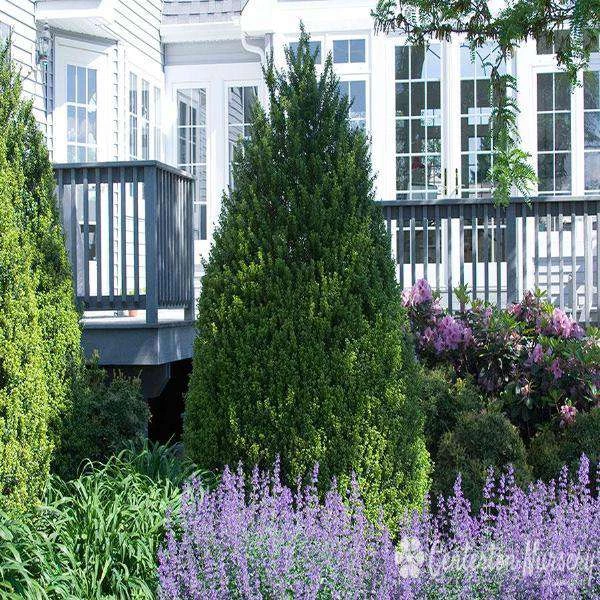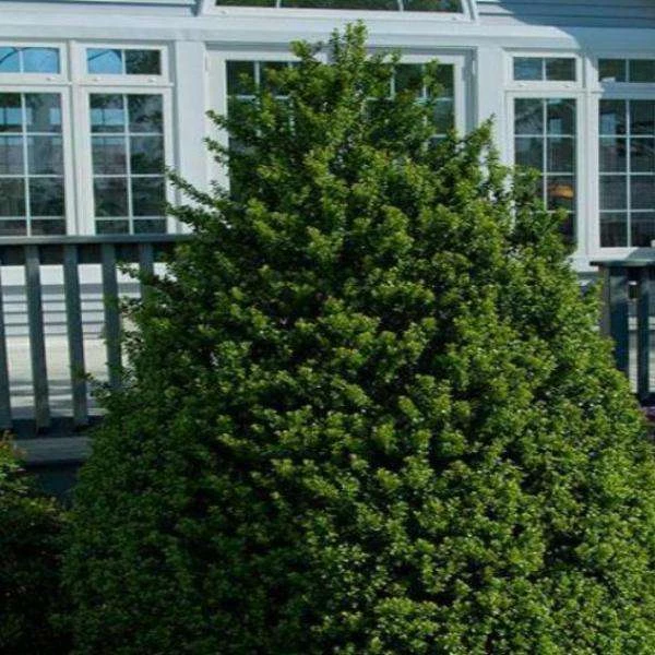 Small leaves in super glossy deep green, compact and dense, upright conical habit, a great alternative to an Arborvitae hedge. Very dense foliage, similar to boxwood. Responds very well to hedging and pruning.Â