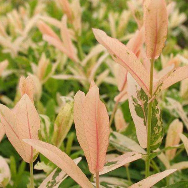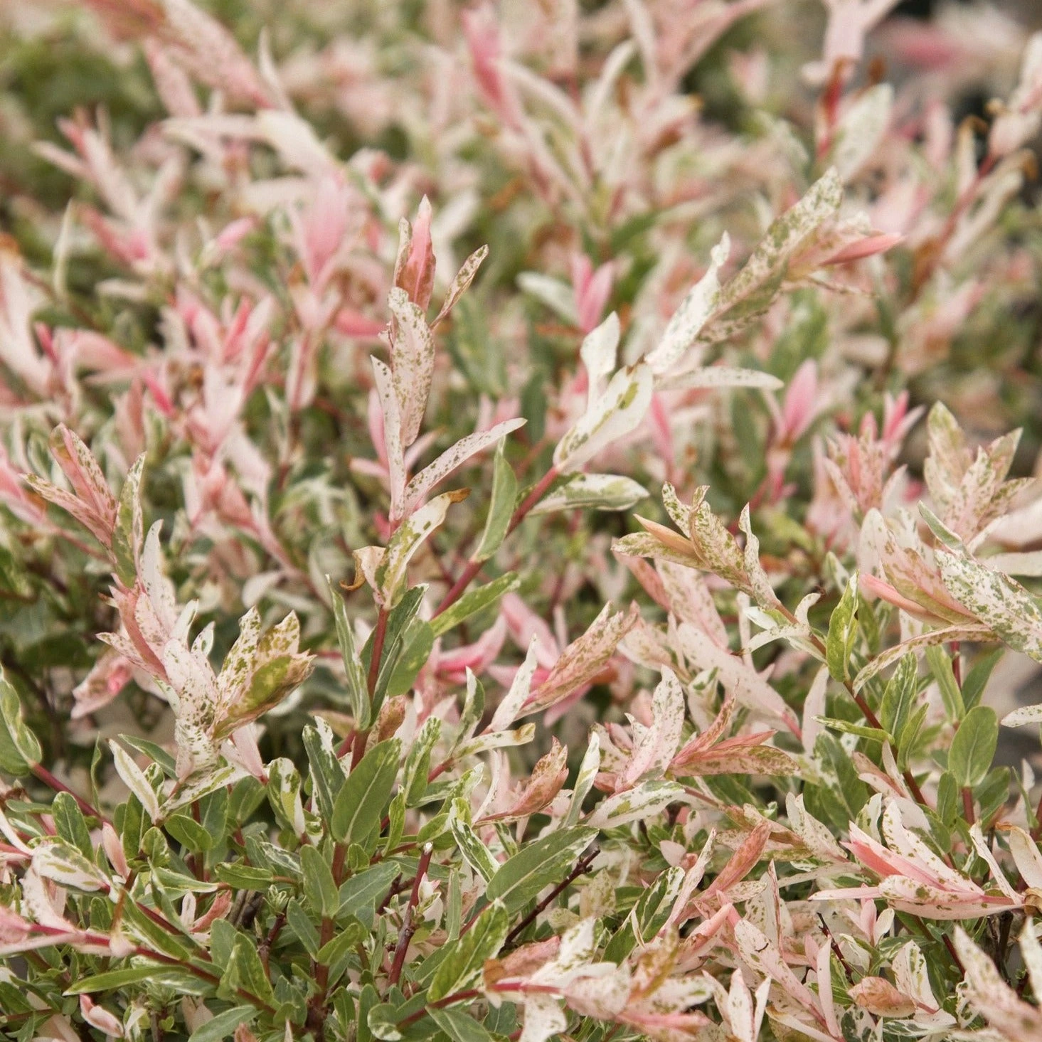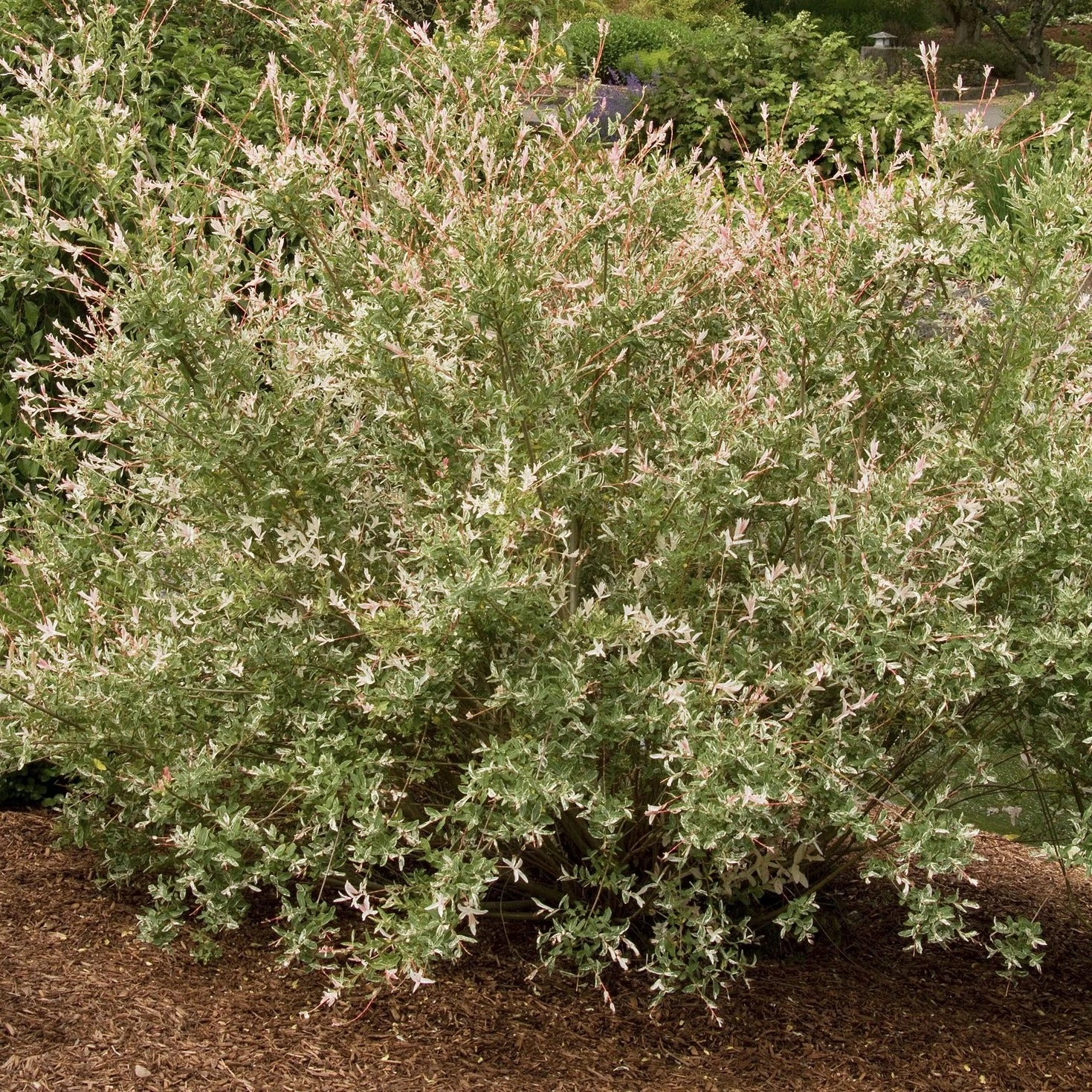 Gorgeous, loosely open deciduous shrub with striking pink and white new growth. Pruning annually encourages new pink growth. Makes an excellent specimen or mass planting. Weeping branches display striking pink stems and buds, surrounded by foliage mottled with white, green and pink highlights. The brightly colored stems provide excellent winter interest. This graceful shrub is a delightful garden accent. Easily maintained at a smaller size with regular pruning. Deciduous.