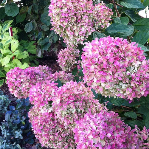 Compared to its famous sibling ‘Limelight’, Little Lime hardy hydrangea (Hydrangea paniculata) may seem like a pipsqueak. Don’t let this petite shrub fool you. While maintaining its short stature of 3-5’ tall and wide, it really packs a visual punch in the garden. In summer, lime green blooms open on strong stems – no drooping here. As it ages, rich pink coloring emerges to prolong the show through fall.