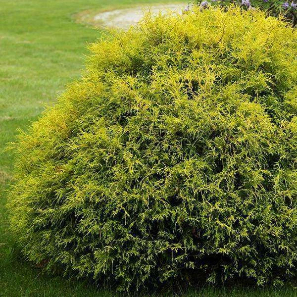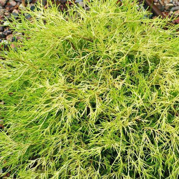 Chamaecyparis pisifera ‘Filifera Aurea’. Clumping evergreen shrub with striking and handsome thread-like yellow foliage. Makes an excellent specimen or large hedge. Once established, needs little maintenance.