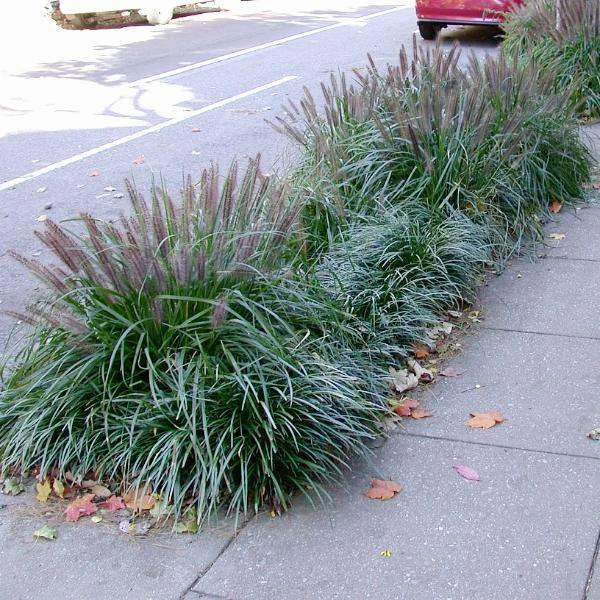 This dwarf variety of fountain grass has medium green arching foliage, providing a good backdrop for the dark brown to black flower plumes in late summer.