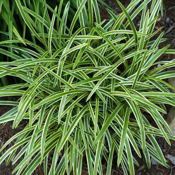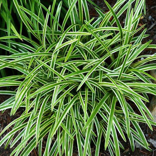 Variegated grassy foliage in arching clumps are the base for the spikes of blue flowers that come in late summer. Great selection for edging or mass planting.