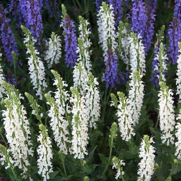 A nice, easy-to-grow salvia with spikes of white flowers from June through September. Lush foliage all season long. Excellent color contrast in the perennial garden.