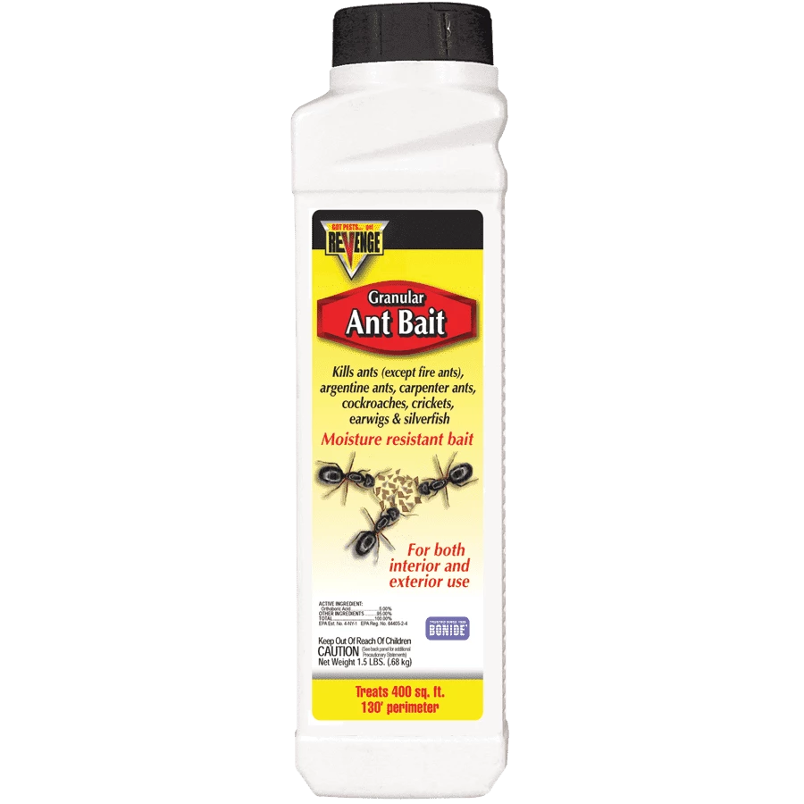 Weather resistant granules attracts and kills both sweet and grease/protein eating ants (including entire colony and queen). Also kills roaches, crickets, mole crickets slugs, snails, earwigs and silverfish. For indoor and outdoor use.