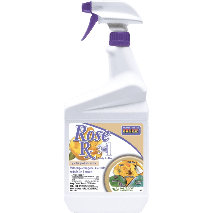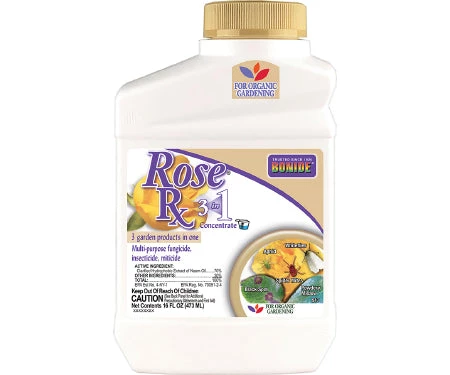 BONIDE Rose Rx (3-in-1), insecticide, fungicide, miticide for organic gardening. Controls plant disease, mites and all stages of insect life cycles. Use on roses, flowers and more.