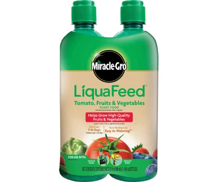 LiquaFeed Tomato, Fruits & Vegetables Plant Food 9-4-9 Refills help develop strong roots and grow high-quality fruits and vegetables. Use with Miracle-Gro LiquaFeed feeder and watering cans. Ready-to-use 2-pack of 16 oz. refill bottles. 400 sq. ft. coverage.