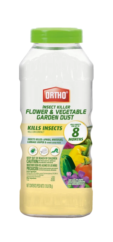 Ortho® Insect Killer Flower & Vegetable Garden Dust kills listed insects for up to 8 months. Ortho® Insect Killer Flower & Vegetable Garden Dust kills a variety of listed insects on your vegetables and flowers including aphids, whiteflies and cabbage loopers. Dust lightly onto upper and lower leaf surfaces and insects will be killed on contact.