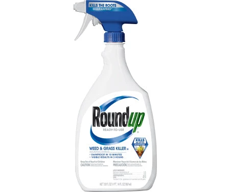 Roundup Weed And Grass Killer kills the toughest weeds and grasses to the root, guaranteed. Convenient, no-mix formula can be used in and around vegetable gardens, flower beds, tree rings and mulched beds, as well as in driveways, walkways and patios. Rain proof in ten minutes. Visible results in 3 hours. Active ingredients: 2% Glyphosate; 2% Pelargonic acid, and related fatty acids.