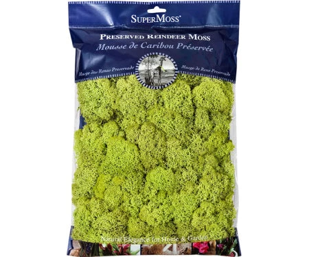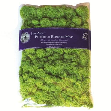 Preserved Bagged Reindeer Moss is easy to use, eco-friendly and recyclable, providing a moss-covered net for all of your creations. Excellent top dressing for plants and trees. Provides a natural look for silk arrangements. Perfect for lining hanging baskets, topiaries, terrariums, bonsai dish gardens and wreaths. Preserved, not dried. Brighter colors. Longer lasting. Softer and more pliable. Dirt free. Provides greater coverage – it is 100% usable. Chartreuse.